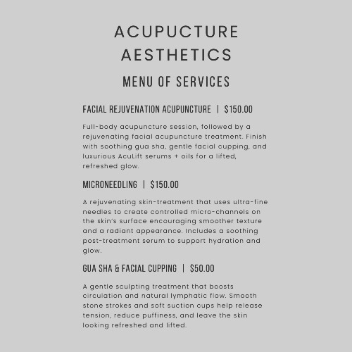 At Acupuncture Aesthetics, we specialize in cosmetic acupuncture, combining time-honored Eastern practices with modern skin therapies to offer a natural, effective approach to anti-aging and rejuvenation. Our treatments seamlessly integrate full-body acupuncture, microneedling, nanoneedling, gua sha, facial cupping, and LED light therapy, all designed to enhance your skin’s vitality and radiance.